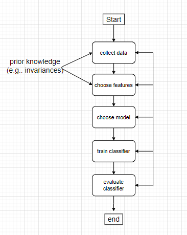* 1. 데이터 모으기 (전문지식 필요) / 2. feature 추출 (전문지식 필요) / 3. choose model (다항식, NN, 확률밀도함수 등등) / 4. train classifier / 5. evaluate calssifier