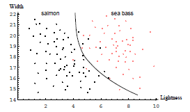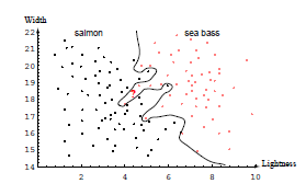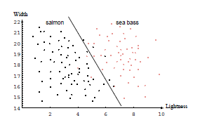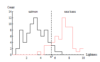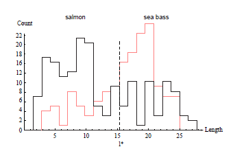 * 이미자 한장한장마다 Bass 인지 Salmon인지에 대한 사전지식과, 각 이미지마다의 feature(ex. length or lightness) extraction 하게되면 위와같이 historam을 plot할 수 있게된다. 이를통해 우리는 패턴인식이 가능해지는 것이다